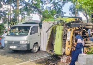 Namun, manuver darurat tersebut membuat truk menabrak pohon dan beton di sisi kiri jalan. Benturan keras menyebabkan truk terguling ke arah kanan dan menimpa mobil pick up yang berada di dekatnya.