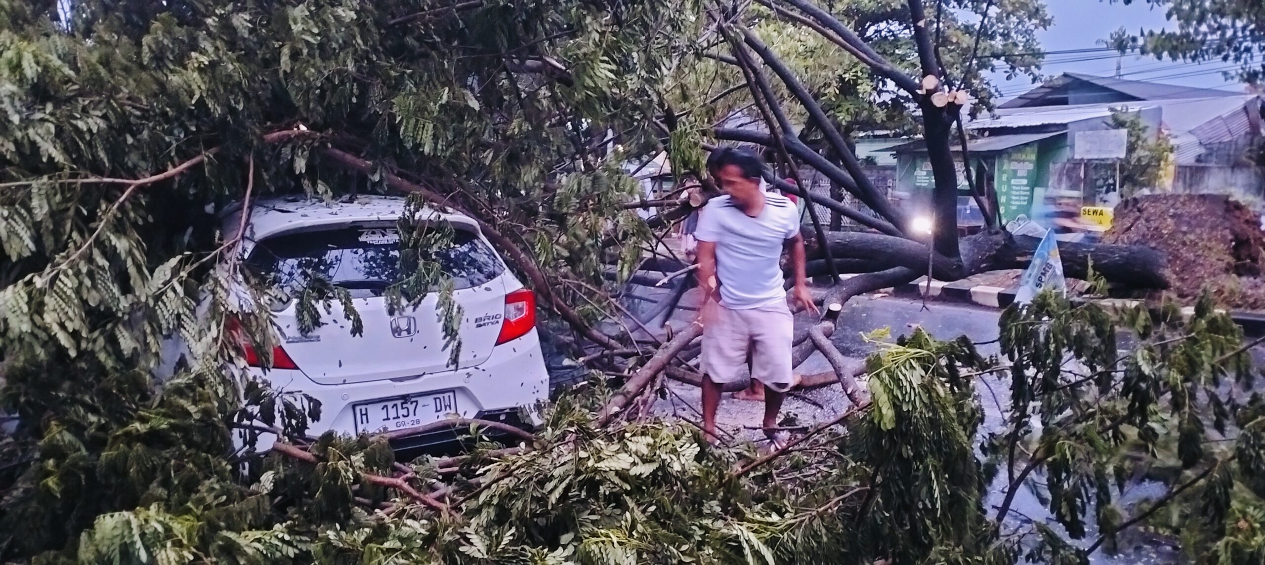 Cuaca Ekstrem Sore Hari, Honda Brio Tertimpa Pohon Tumbang di Gisikdrono Semarang Barat