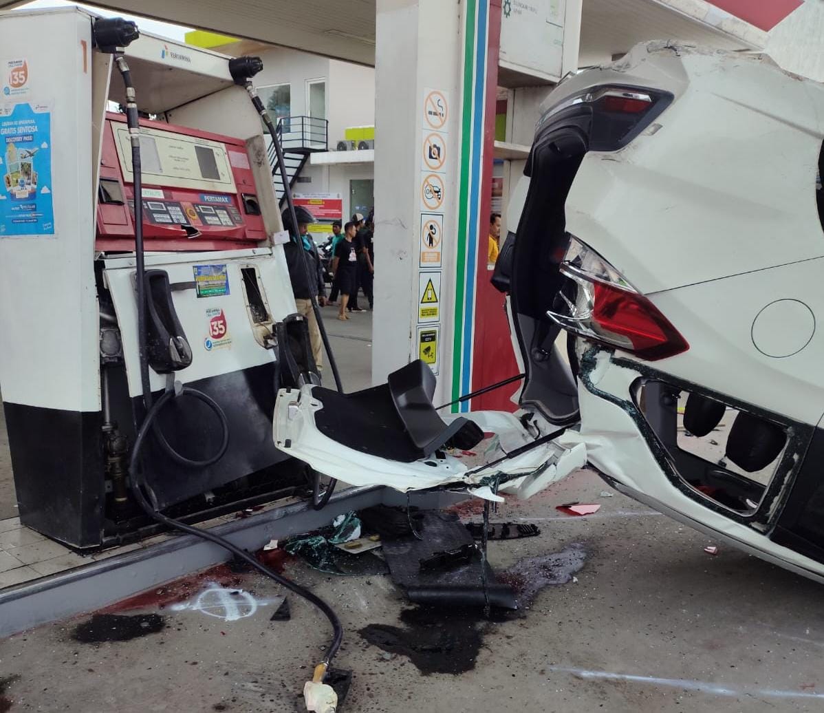 “Mobil menabrak pembatas taman SPBU hingga terguling. Dalam posisi terguling, kendaraan membentur sepeda motor yang sedang mengisi BBM serta operator SPBU yang berada di dekat dispenser,” jelasnya.