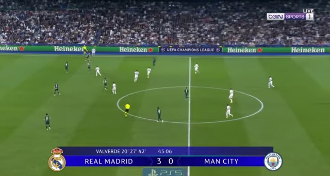 Petaka bagi The Citizens memuncak menjelang turun minum. Valverde mencetak gol ketiganya dan menuntaskan hat-trick sensasional yang membuat publik Bernabéu meledak dalam euforia. Skor 3–0 di babak pertama menjadi pukulan telak bagi Manchester City.