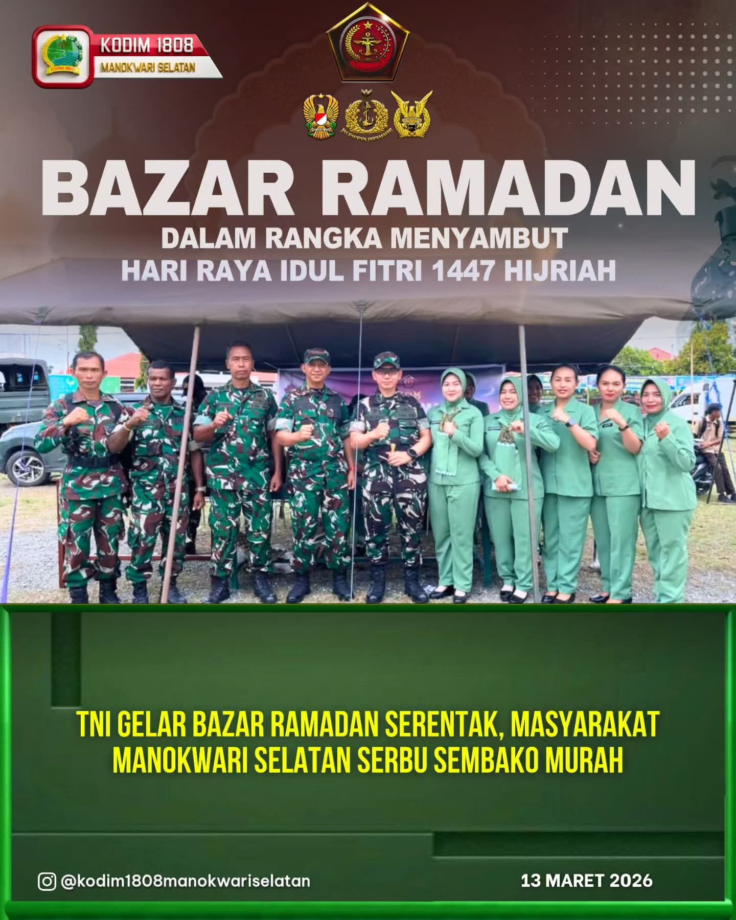 RANSIKI || detikindonesiasatu.com – Semangat berbagi di bulan suci Ramadan terpancar di Panggung Gembira Ransiki, Jalan Sujarwo Condronegoro, SH, Kabupaten Manokwari Selatan. Pada Jumat (13/3/2026), jajaran TNI di wilayah tersebut menggelar Bazar Ramadan 1447 H yang terhubung langsung melalui Video Conference (Vicon) dengan Mabes TNI.