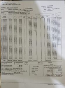 Dengan besar hati AL akan membayarnya, namun bukan Rp.45.552 tapi harus membayar Rp.50.571.528,- padahal menurut AL pinjaman dari tahun 2016 , kurang Rp.45.552, tapi kok masih ada tunggakan dan harus membayar begitu banyak nya “saya kaget pak, kenapa harus bayar begitu banyaknya, setelah saya mau ambil sertifikat, saya mohon keadilan,” Ungkapnya.